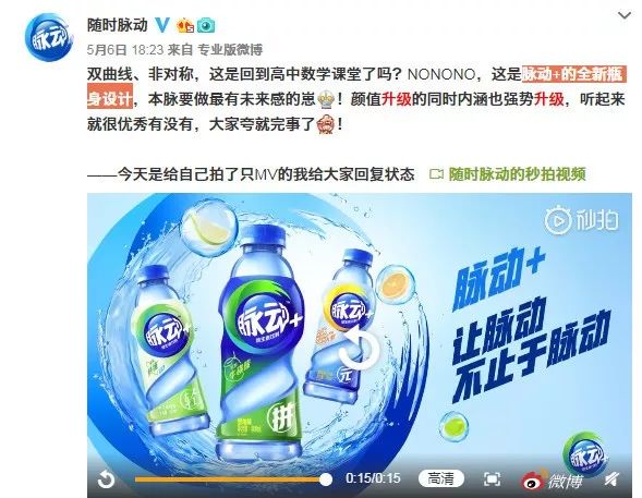 但是值得學習的地方是我們看到脈動一直在強化自己魚眼的LOGO視覺標簽,這個是很難能可貴的,從新LOGO的改變中我們就看到,這個魚眼圍繞的水圈被作為自己品牌的超級符號應用于其產品本身的海報及包裝上,且顏色根據產品的口味進行漸變式的改變,真的還是蠻占據市場心智的哈!