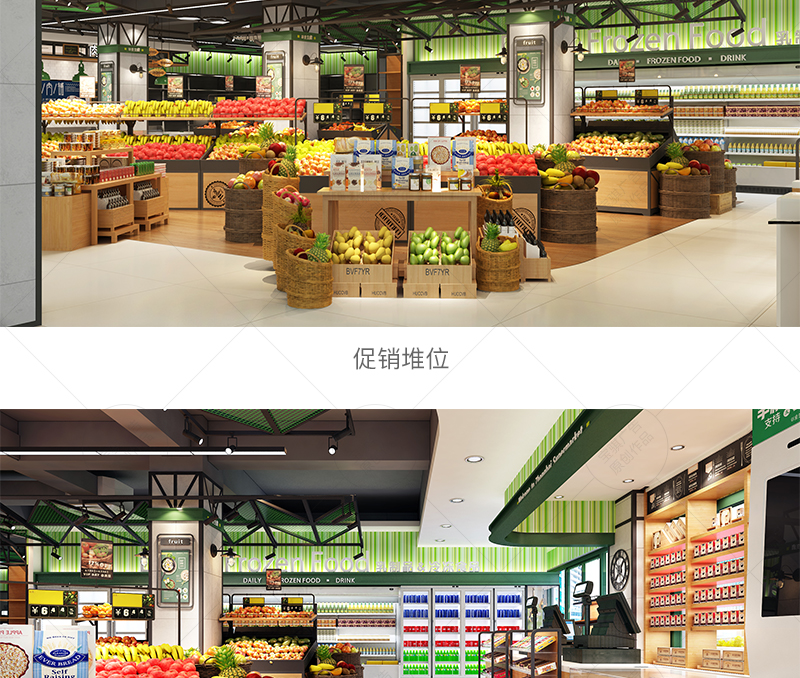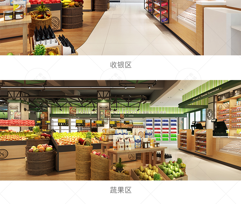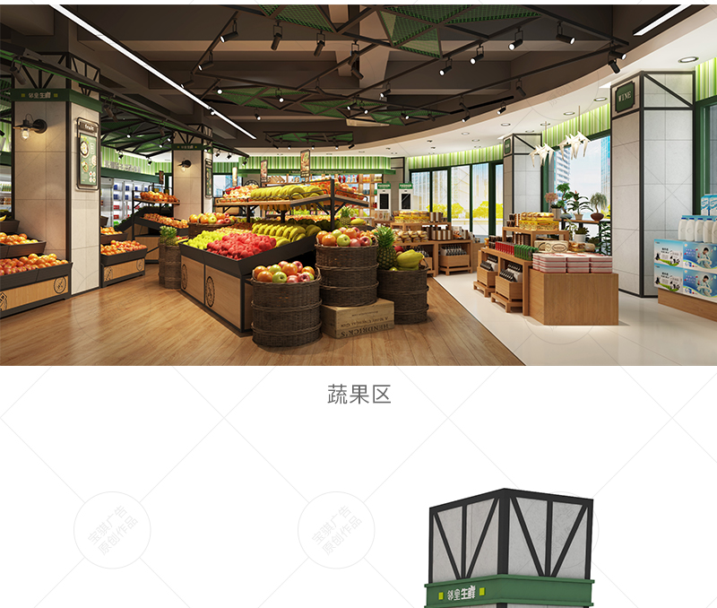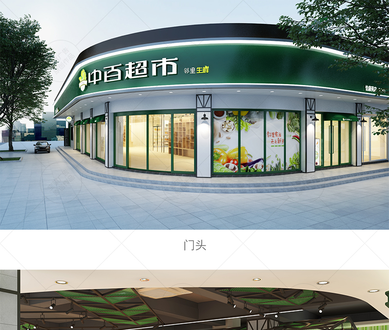 該店延續中百超市第三代鄰里生鮮綠標店設計風格,根據門店條件,因地制宜進行平面布局規劃,提升空間利用率的同時,注重場景化設計,給顧客提供輕松、溫馨的購物氛圍。